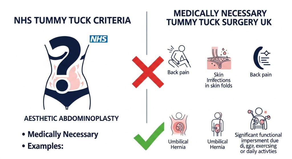 The NHS tummy tuck criteria apply only when a medical need is proven, such as chronic skin infections or pain caused by overhanging skin folds.